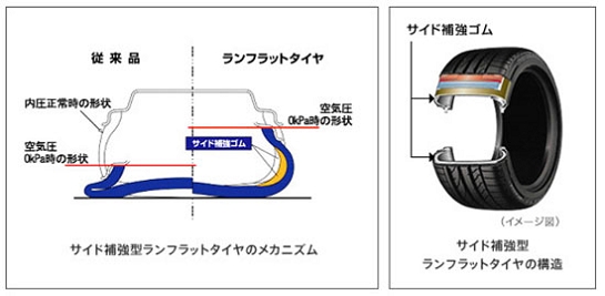 ランフラットタイヤは、空気圧が0ゼロになっても80㎞/h以下の速度で約80㎞程走れる特殊なタイヤなので、パンクしたままの状態でカーディーラー・修理工場・タイヤ専門店まで走れるタイヤです。車載工具を使って補助タイヤにタイヤ交換する手間がかからないメリットがあります。ランフラットタイヤ装着車両は、警告灯が光り空気圧が減ったことをドライバーに知らせてパンクを知らせてくれます。